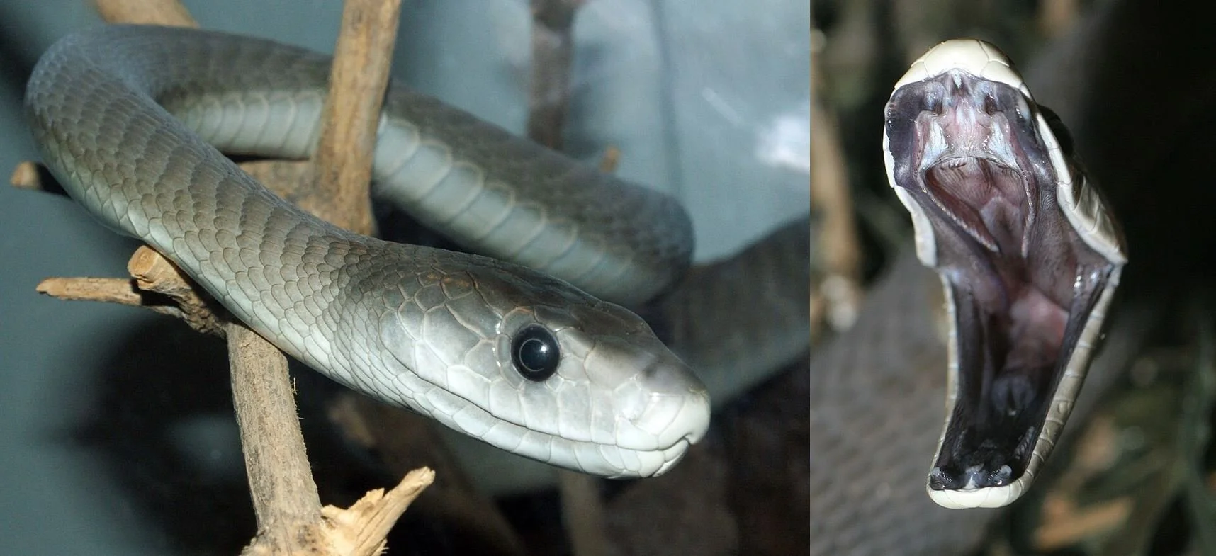 Caption: it might be that part of the Crowing crested cobra legend is based on encounters with Black mambas, perhaps individuals with a ‘frill’ form of sloughed skin. The Black mamba is so named because its mouth interior is black. Image: TimVickers, public domain (original here); Tad Arensmeier, CC BY-SA 3.0 (original here).