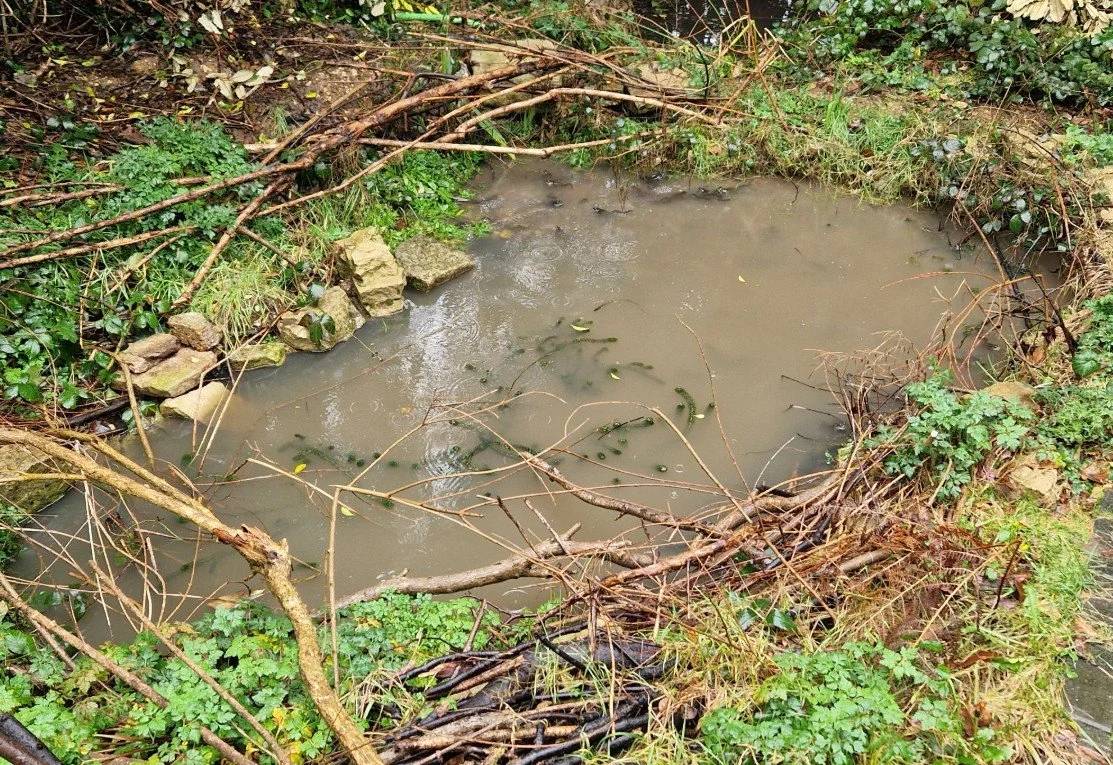 Things get underway. Male Common frogs are quite probably in a breeding pond throughout the whole of the winter, and hence ready to intercept arriving females and get things underway as early as possible. This year, a reasonable number of frogs (12) were readily visible on February 3rd, and two spawn clutches appeared on that day: a new earliest-ever record here (the previous was February 4th, for 2025). Constant heavy rain meant that the pond was at an all-time high, a fact that would have consequences once the rain actually died down…