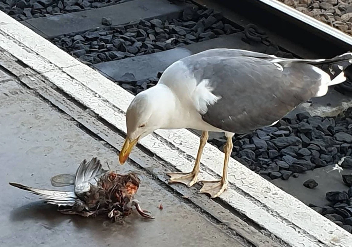 Caption: pigeons do have to deal with a list of predators, even in urban environments. Falcons and domestic cats are pigeon-killers of course, but so are gulls and corvids. This Lesser black-backed gull Larus fuscus at Bristol train station learnt how to kill feral pigeons and I watched it do this once. Image: Darren Naish.