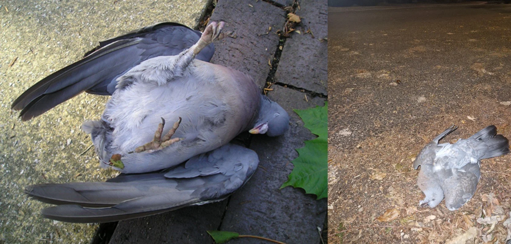 Caption: pigeons are frequently encountered as roadkill here in the UK. The Common wood pigeon Columba palumbus at left was dead at the side of the road and its lack of rectrices show that it had undergone ‘terror moulting’ prior to death, though whether this happened literally moments before it expired or hours or days before is unknown to me. At right, a juvenile wood pigeon on a road. Its position implies that it fell from the tree above before being hit by a car. Images: Darren Naish.