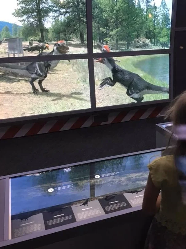 Caption: there's so much to see through the windows that, even after multiple visits, I still haven't seen it all. In this sequence (seen while looking across the Dakotaraptor nesting colony), two female dromaeosaurs engage in a squabble. Image: Kerry Mulvihill.